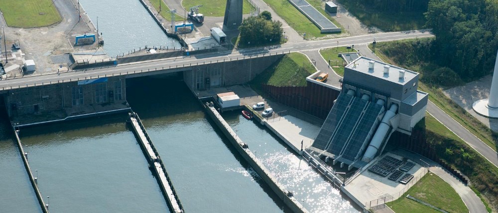 De waterkrachtcentrale op het Albertkanaal ter hoogte van de scheepvaartsluizen van Ham (foto De Vlaamse Waterweg nv) - thema waterweg. Wetenschappelijk onderzoek, monitoring en advisering rond ecologische aspecten in en rond de waterwegen. Het onderzoek in getijdengebieden valt integraal onder dit thema, net als het onderzoek naar natuurvriendelijke oeverinrichtingen, het bomen-, bever- en Maasonderzoek