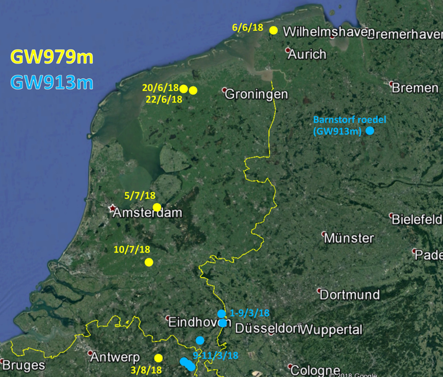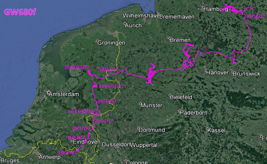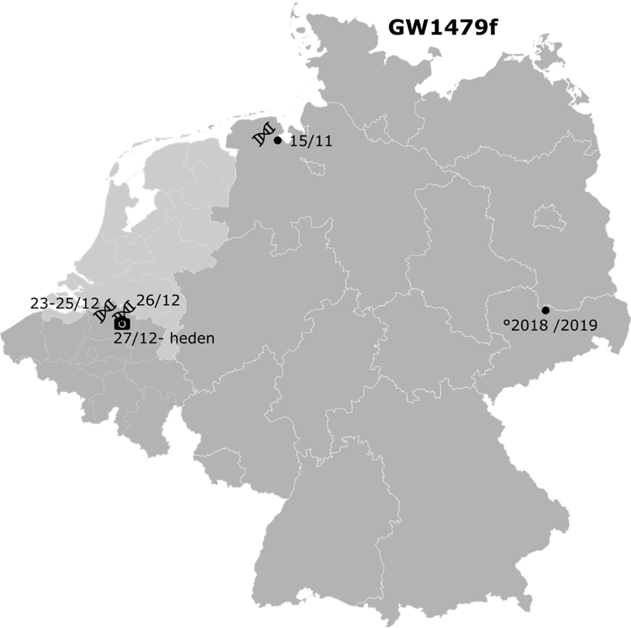 DNA-sporen van wolf August (GW979m, geel) en Roger (GW913m, blauw) werden gevonden in Duitsland en Nederland op hun route naar België. August is niet uit een Duitse roedel afkomstig, maar komt waarschijnlijk uit Polen. Roger’s DNA konden we toewijzen aan een gekend wolvenpaar uit Barnstorf, niet ver van Bremen.