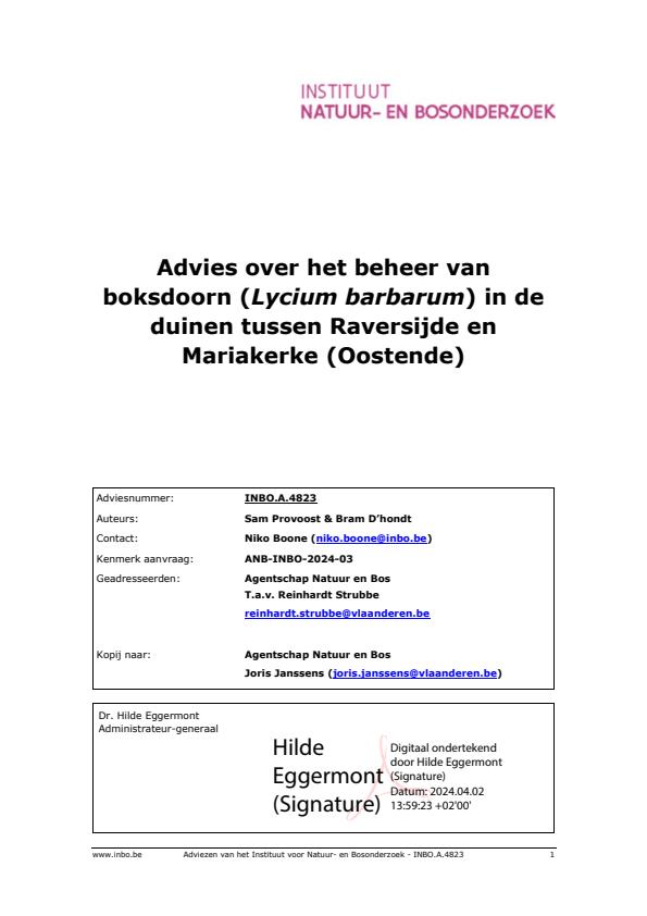 Advies over het beheer van boksdoorn (Lycium barbarum) in de duinen tussen Raversijde en Mariakerke (Oostende)