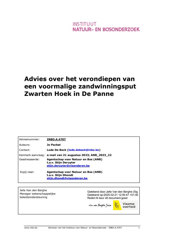 abstract = "In het deelgebied ‘Zwarten Hoek’ van het Vlaams Natuurreservaat ‘Duinen en bossen van De Panne’, heeft ANB het idee om een voormalige zandontginningsput te verondiepen. Enerzijds moet ANB in de omgeving gronden afgraven om deze ecologisch te optimaliseren en anderzijds lijken er voor ons nog mogelijkheden om de ecologische waarde van de vijver te optimaliseren, meer in het bijzonder de steile oevers. ANB vraagt aan INBO wat de mogelijke impact kan zijn van het deponeren van gronden in deze vijver.",