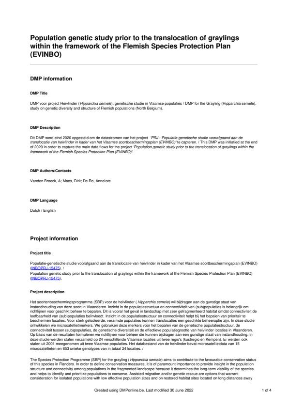 abstract = " This DMP was initiatied at the end of 2020 in order to capture the main data flows for the project 'Population genetic study prior to the translocation of graylings within the framework of the Flemish Species Protection Plan (EVINBO)'.",