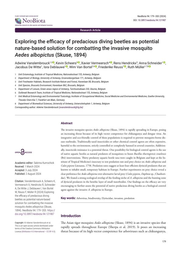 abstract = "The invasive mosquito species Aedes albopictus (Skuse, 1894) is rapidly spreading in Europe, posing an increasing threat because of its high vector competence for chikungunya and dengue virus. An integrative and eco-friendly control of these populations is required to prevent mosquito-borne disease outbreaks. Traditionally-used insecticides or other chemical control agents are often expensive, harmful to the environment, strictly controlled or completely banned in several countries. Additionally, insecticide resistance is a potential threat. One possibility for biological control agents is the use of native aquatic beetles as natural predators of mosquitoes to boost Bacillus thuringiensis israelensis (Bti) interventions. Thirty predatory aquatic beetle taxa were caught in Belgium and kept at the Institute of Tropical Medicine’s insectary to test predation rate and prey choice on Aedes albopictus and Culex pipiens Linnaeus, 1758. Predation rates suggest at least four efficient dytiscid predators that are known to inhabit small, temporary habitats in Europe. Further experiments on prey choice reveal a clear preference for Aedes albopictus over alternative larval prey (Culex pipiens, Daphnia sp., Chaoboridae). We found a strong ecological overlap of the feeding niche of A. albopictus and the hunting zone of dytiscid predators in the benthic layer of small waterbodies. Our findings on the efficacy are very encouraging to further assess the potential of native predacious diving beetles as a biological control agent against the invasive A. albopictus in Europe.",