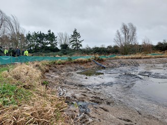 Two days later, the water level was lowered enough to move to the next step: application of calcium oxide. Also known as quicklime, it is a chemical compound that looks like a white powder and that, once added to the water, increases the pH considerably making the water unsuitable for African clawed frogs. It’s a dangerous product that requires the use of safety equipment such as overalls, gloves and goggles. After maintaining such a high pH level, also applying the quicklime on the lakeshore, all the frogs and all the living matter should disappear. Then, after a while, rainwater should fill the ponds again, the pH level will go back to normal values, the calcium oxide basically reacts to form carbon dioxide and water, and the environment returns to its original state so that native animals and plants can colonize them again.