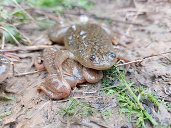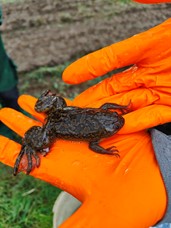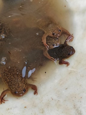 Arriving at the site, I realize the very round shape of the ponds due, in all probability, to the explosion of a bomb during the First World War. It is not uncommon in these parts to see pools that have such origin. The whole area was affected by the war, and it is also for this reason that the landscape is bare and with poor environments. Despite my past experience with aquatic invaders, I have a bit of a hard time imagining how species, even the hardiest, could survive in this ecological wasteland. Yet, here, on a very rainy January 2023 morning, an important biodiversity conservation action was underway. A new alien, potentially invasive, species is threatening biodiversity here. Here is the African clawed frog, scientific name Xenopus laevis.