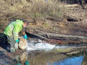 To avoid this, a “frog-proof” fence is first installed around the water with buckets so that individuals trying to find an exit or entrance along the fence, can be recuperated. Buckets were also placed on the outside to intercept any native toads, salamanders or frogs on their way to a treated pond, or, who knows, new African clawed frogs climbing out of the brook.