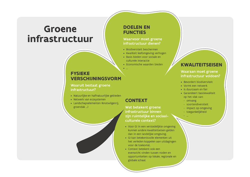 “Groene infrastructuur is een netwerk van kwaliteitsvolle natuurlijke en halfnatuurlijke gebieden en landschapselementen die natuurlijke processen herbergen. Het beheer en gebruik ervan heeft tot doel de biodiversiteit te beschermen en andere maatschappelijke doelen te realiseren in zowel een landelijke als een meer verstedelijkte omgeving.”