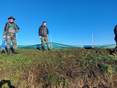 Op de eerste dag van mijn veldwerk waren de omstandigheden nogal zwaar. Het had al dagen hard geregend. Het gebied rond de vijvers was erg modderig. Ik droeg een waadpak, niet om het water in te gaan zoals ik gewend ben, maar gewoon om door de modder te kunnen ploeteren. Op sommige plekken was er zoveel modder dat ik bijna tot aan mijn knieën wegzakte. Bovendien was het echt koud en dat maakte het veldwerk minder evident. De boterham die ik voor de lunch had meegenomen bracht gelukkig wat verlichting...