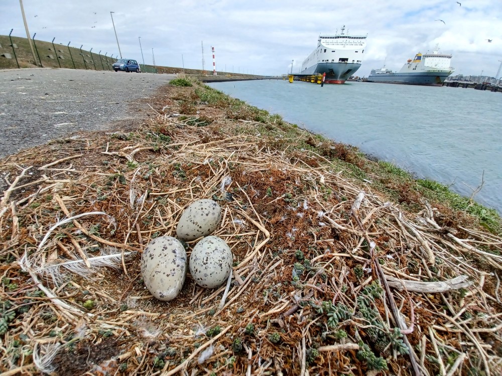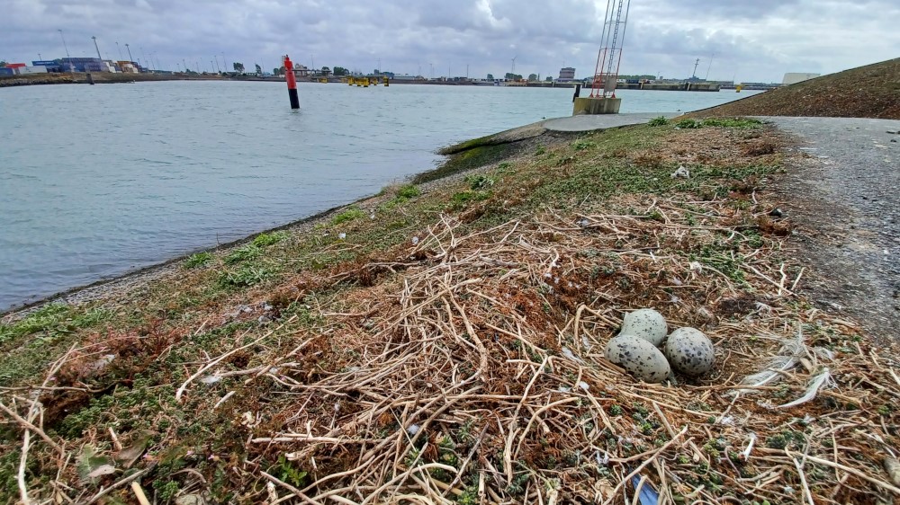 “We waren begin juni in het Brittanniadok meeuwen aan het onderzoeken toen Hans plots zei dat hij een ‘vreemde meeuw’ zag. Met de verrekijker merkten we dat het een grote mantelmeeuw was. Toen de vogel alarm sloeg, wisten we: hier is een nest! Al snel vonden we op het einde van het dok het nest met drie eieren van formaat.”