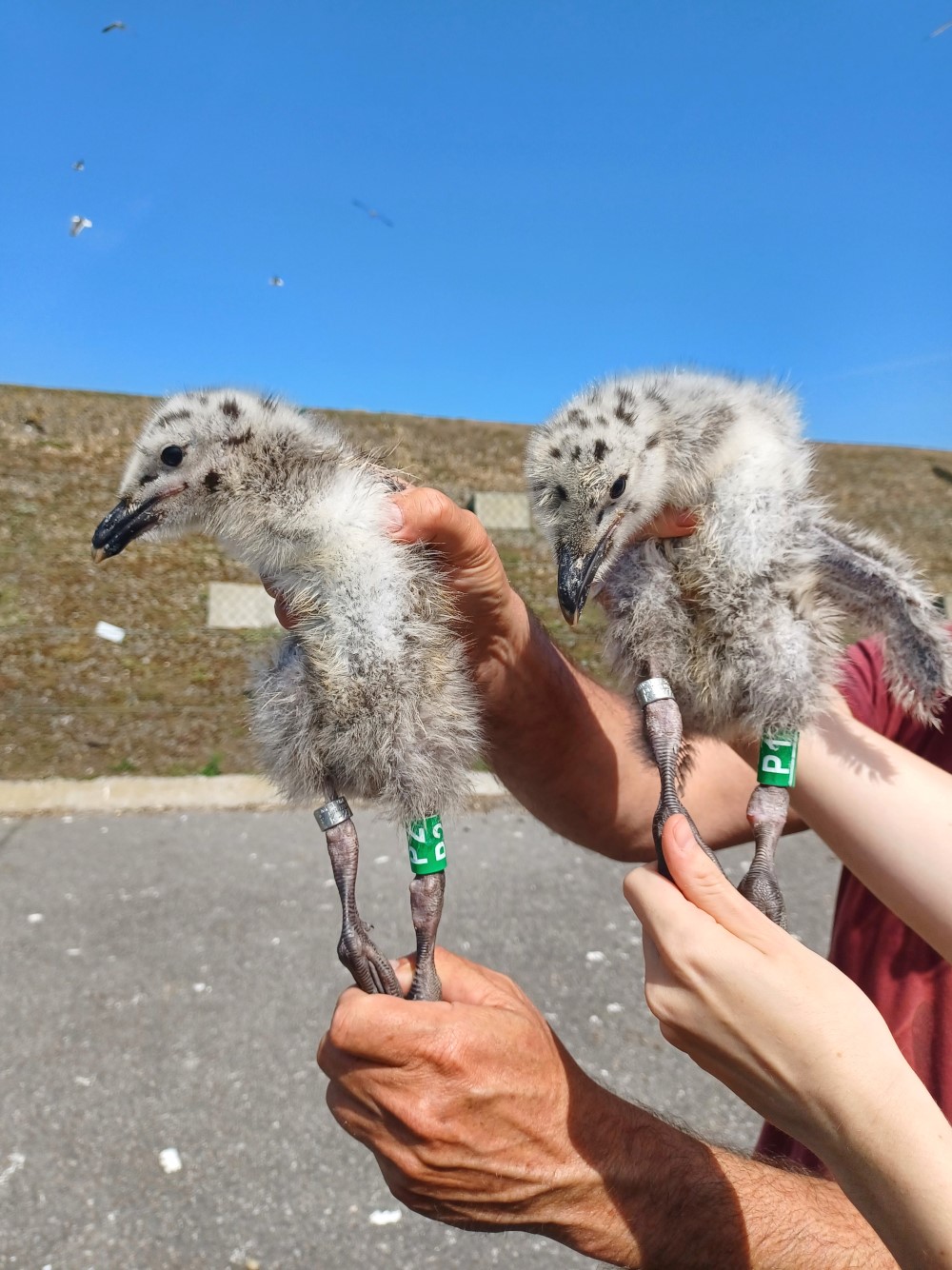 De kuikens P1 en P2 kregen een combinatie van een metalen en een kleurring, aan de tibia (boven de knie). Dat werd zo bepaald door de kleurringcoördinator. De vogels worden opgevolgd voor het project https://cr-birding.org/node/1080. Dat is een Nederlands project. Dat klinkt misschien vreemd omdat de vogels op Vlaamse bodem geboren zijn, maar een nieuw project opstarten is vrij duur. We besloten daarom om deze twee kuikens mee te laten opvolgen door een Nederlands onderzoeksproject dat al andere grote mantelmeeuwen opvolgt.