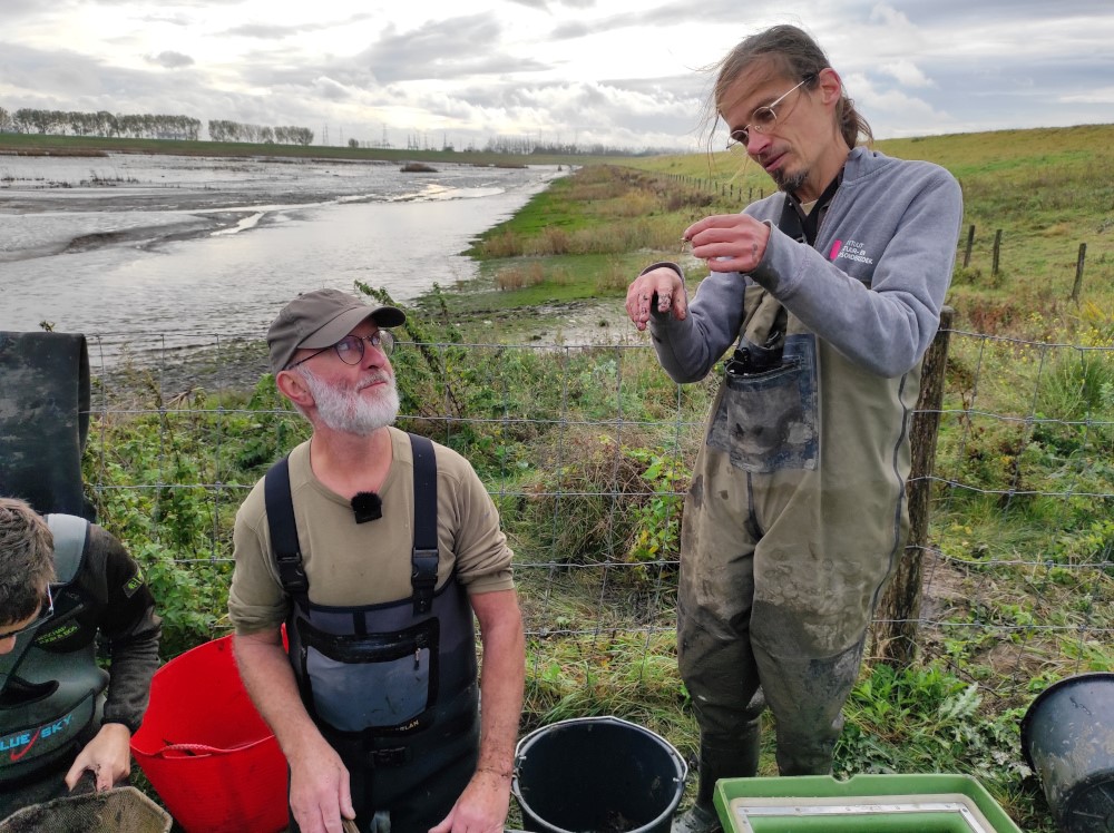 Mark Staut is vrijwilliger bij Natuurpunt Waasland-Haven en volgt de visbestanden op in het gebied. Op 26 oktober 2023, een dag voor medewerkers van het ANB en INBO langskwamen om de stand van zaken op te nemen, plaatste hij twee dubbele schietfuiken. De fuiken werden tegenover elkaar geplaatst in twee verschillende geulen en bevatten bovenaan drijvers en onderaan een loodlijn. “Op die manier staan de netten strak opgespannen in de waterkolom en vangen ze alle vissoorten die erdoorheen zwemmen. Beide netten werden geplaatst 24 u voor we ze gaan legen. Op die 24 u komen zowel bij eb als bij vloed vissen in de fuiken terecht en kunnen we vangen in beide richtingen”, zegt Mark.