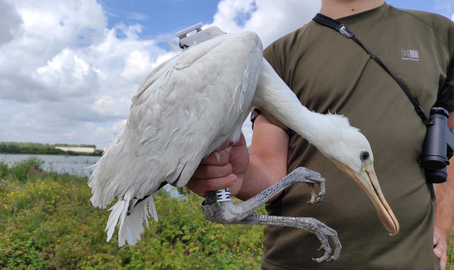 “Het antwoord op deze vragen zou je kunnen krijgen met zichtwaarnemingen, maar dan dan sta je uren en uren te turen door een verrekijker om heel weinig te weten te komen. Bovendien zijn lepelaars vrij snel uit het zicht verdwenen. Dit is een vrij onoverzichtelijk gebied om lepelaars op te volgen met zichtwaarnemingen. Daarom kozen we voor een andere onderzoeksmethode: we brengen zenders aan. Vorig jaar, in 2022, en ook dit jaar, in 2023, kregen telkens vijf jonge lepelaars – die op punt staan van uitvliegen- een zender op de rug”, vertelt Spanoghe.