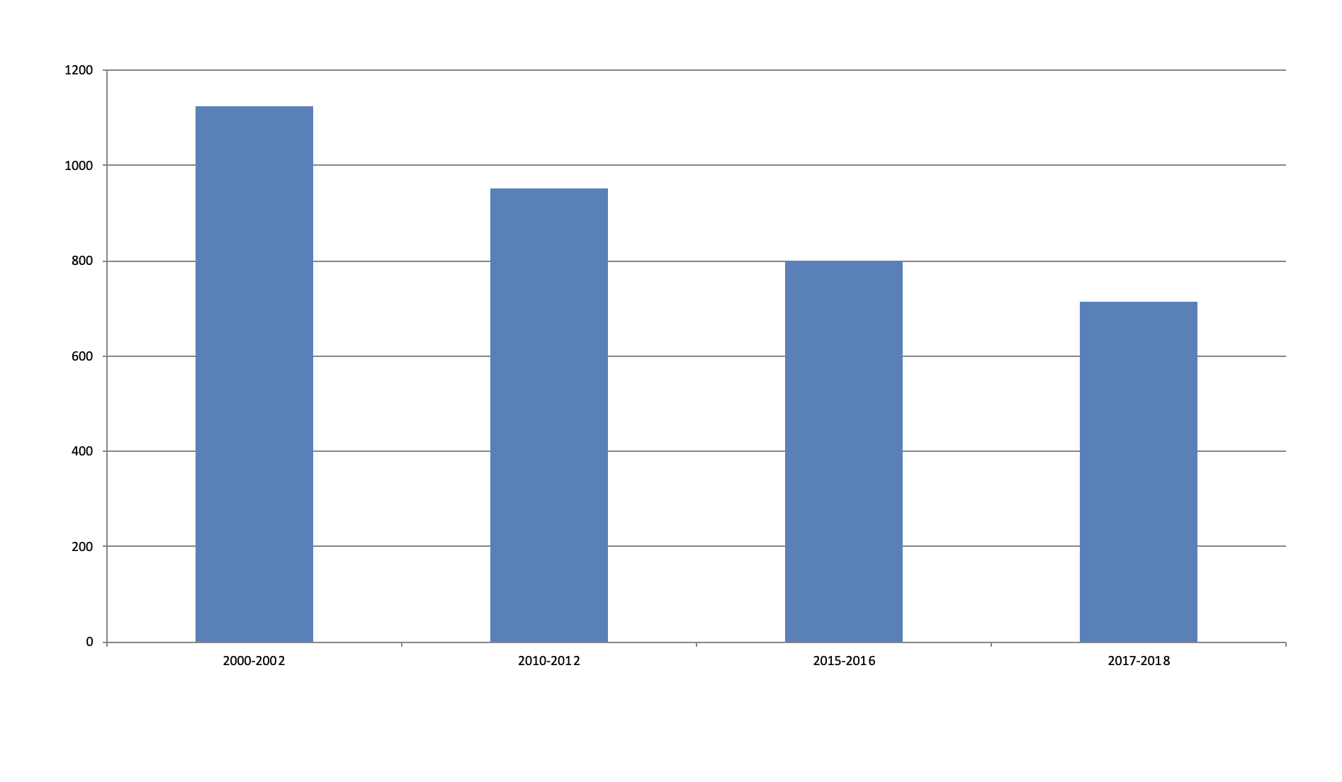 Fig. 3 Sinds de publicatie van de vorige broedvogelatlas (Vermeersch et al. 2004) nemen de aantallen grutto’s in Vlaanderen fors af (van ca. 1125 broedparen in 2000-2002 tot ca. 715 broedparen in 2017-2018).