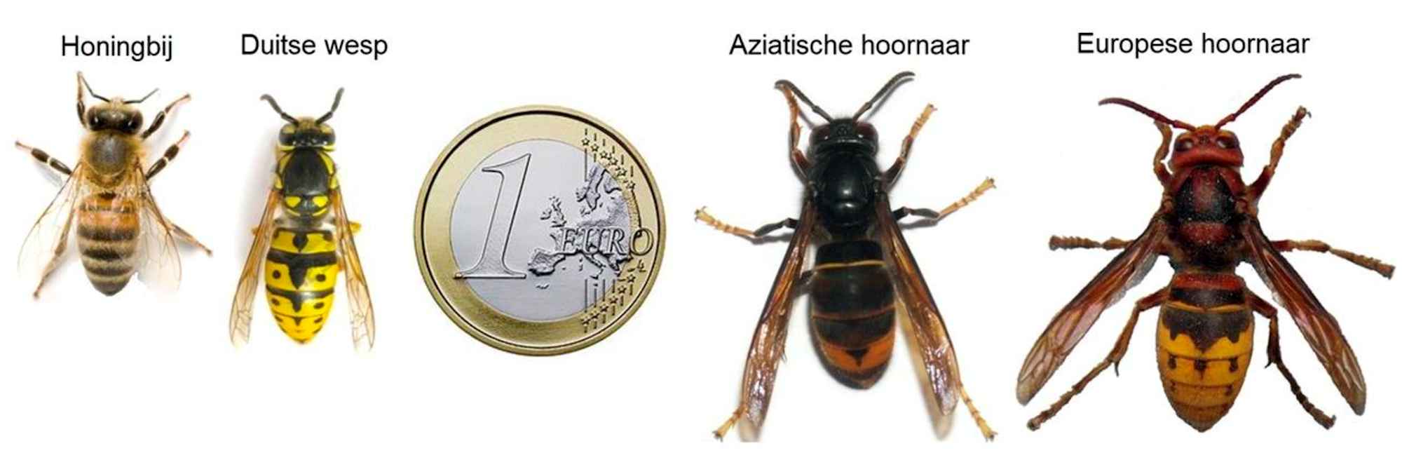 De Aziatische hoornaar mag niet verward worden met de inheemse en onschadelijke Europese hoornaar. Gelukkig zijn de soorten vrij makkelijk van elkaar te onderscheiden. De Aziatische hoornaar is iets kleiner dan de Europese hoornaar en is donker gekleurd met een gele band op het achterlijf. De Europese hoornaar, daarentegen, heeft een roodbruine kleur en veel geel op het achterlijf. De pootjes van de Aziatische hoornaar zijn zwart met opvallend gele tipjes. Dood zeker geen Europese hoornaars en laat nesten van deze vriendelijke reus met rust. Het zijn belangrijke concurrenten van de Aziatische hoornaar die onmisbaar zijn om de uitheemse hoornaar in bedwang te houden.