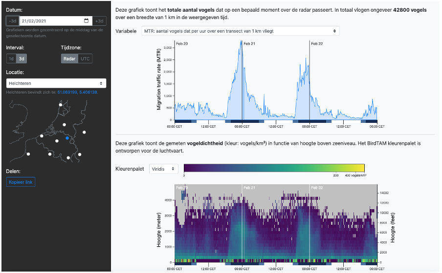 De nieuwe webapplicatie ingesteld op de radar van Helchteren, en op een tijdsperiode van drie dagen rond 21 februari 2021. Door het uitzonderlijk warme weer in die periode kwam de voorjaarstrek vroeger op gang dan normaal. Op de getoonde figuren is het duidelijk dat de meest intense migratie telkens in de eerste helft van de nacht plaatsvindt. De vogels bereiken daarbij hoogtes tot 3 km (en soms zelfs meer).