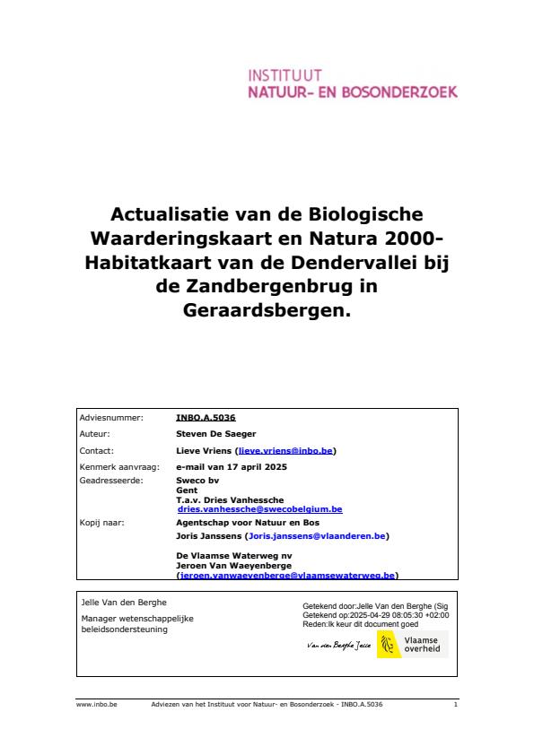 abstract = "Voor de vernieuwing van de Zandbergenbrug over de Dender in Geraardsbergen is een recente kartering van de Biologische Waarderingskaart in het projectgebied gewenst. Het gebied overlapt niet met habitat- of vogelrichtlijngebied. De BWK en Natura 2000-Habitatkaart zijn in de periode 2023-2024 grotendeels geactualiseerd op basis van terreinkartering. Enkel de kartering van het kasteeldomein De Lalaing dateert nog van 2004. Via dit advies wordt de recente actualisatie gepubliceerd.",
