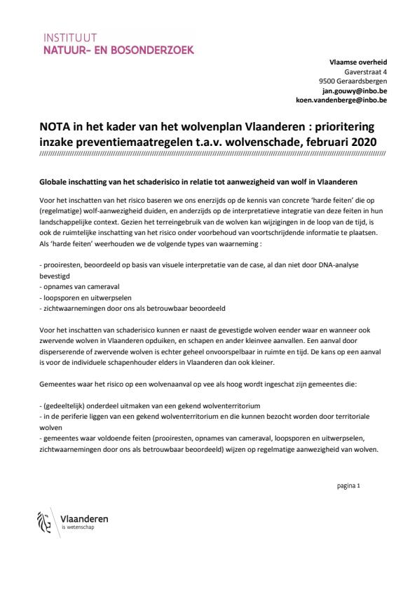 abstract = "De Vlaamse overheid voorziet subsidies voor particuliere veehouders die maatregelen nemen om hun kleinvee tegen de wolf te beschermen. Deze middelen zijn enkel voorzien in die gemeenten waar de kans groot is dat een of meerdere wolven actief kunnen zijn, de zogenaamde risicozone. Deze wordt afgebakend door het INBO en kan driemaandelijks geactualiseerd worden op basis van de beschikbare kennis over de verspreiding van wolven in Vlaanderen. Ook niet-professionele rundvee- en paardenhouders kunnen subsidies ontvangen voor het nemen van wolfwerende maatregelen. Dit kan enkel binnen de zogenaamde schutkring. Voor het instellen van een schutkring is een advies van het INBO nodig. De huidige schutkring is geldig tot 28/02/2025.",