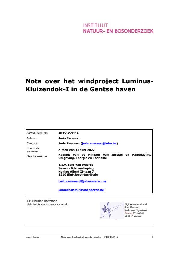 abstract = "De milieuvergunning van het windturbinepark Kluizendok I in het Gentse havengebied liep af op 18 februari 2024. Luminus wil deze milieuvergunning laten omzetten naar een omgevingsvergunning van onbepaalde duur om de uitbating verder te zetten. Voor deze omzetting is geen MER of passende beoordeling vereist. Er werd toch een nota met een update van de mogelijke impact op natuur (vogels, vleermuizen) gemaakt. Hierin concludeert men dat er geen effecten op de natuur denkbaar zijn en dat er geen milderende maatregelen nodig zijn. Bij recenter vergunde windturbines verderop in de haven werd een stilstandregeling voor overwinterende meeuwen opgelegd. De vraag rijst of dit ook hier nodig is. In deze nota voor het kabinet argumenteren we waarom we een gerichte stilstandregeling niet nodig achten. ",