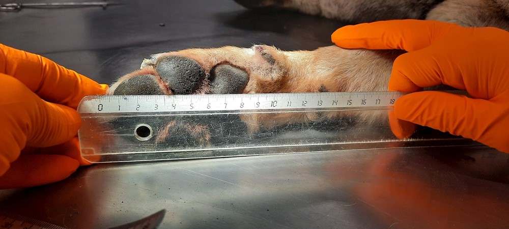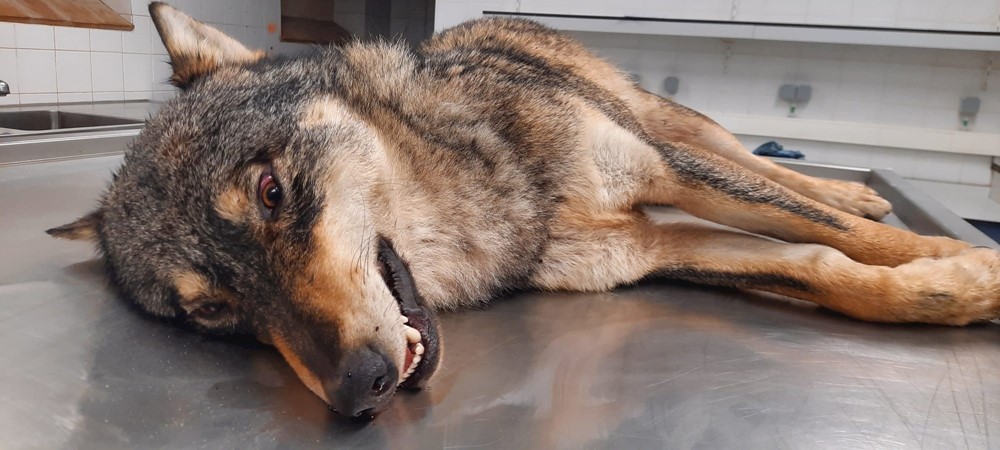 - Zo kon op 30 december een wolf gefilmd worden in Leuven, op 31 december in Rijkevorsel en op 1 januari 2022 in drie verschillende regio’s: in Kasterlee/Retie, in Schilde én in Sint-Truiden. De wolf van Sint-Truiden liep in de richting van Hasselt, waar hij op 2 januari dood werd opgevist uit het Albertkanaal. Het bleek om een mannetje te gaan en op basis van het uiterlijk van deze wolf was al snel duidelijk dat het geen jaarling uit de Hechtel-Eksel roedel was. Ons vermoeden, o.m. op basis van het afwijkende uiterlijk, dat het om een Alpiene wolf kon gaan werd bevestigd via het genetisch onderzoek. Deze wolf is nieuw in de database van CEWolf en kreeg de code GW2506m. Dit mannetje was in goede conditie maar eerder klein van formaat, woog 30,9 kg en had opvallend kleine voorpoten (net zoals de Alpiene wolf in Kalmthout). Op basis van de slijtage aan de snijtanden konden we al vermoeden dat dit geen welp was maar een jaarling (+- 20 maanden oud). Dit werd bevestigd via een RX van de hoektanden: de hoektandwortel bij welpen is nog hol, bij deze wolf was de holte nagenoeg dichtgegroeid. Ook het gewicht van de teelballen, 8,06 en 7,71 gram, gaven een indicatie dat we hier met een volgroeid mannetje te maken hadden. Ter vergelijking: de teelballen van de welp uit de Hechtel-Eksel roedel die in november 2021 op een leeftijd van exact zeven maanden stierf in het verkeer wogen 3,02 en 2,91 gram. De autopsie bracht verder bevestiging dat de wolf verdronken was. De nagels waren sterk afgesleten ten gevolge van de pogingen uit het kanaal met rechte betonnen oevers te klimmen. De maag was leeg.