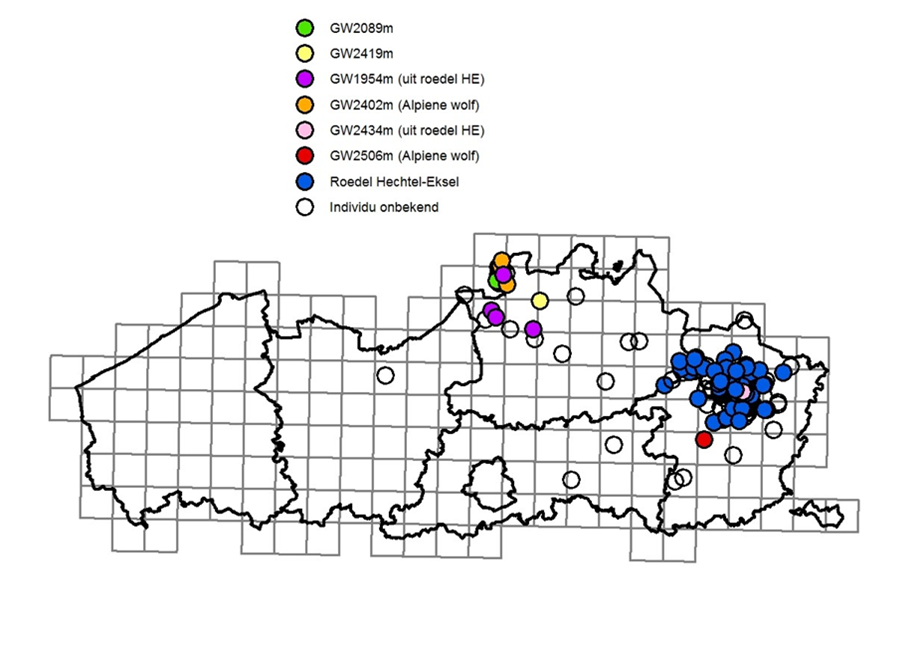 - GW2419m, werd in november 2021 voor het eerst op diverse plaatsen in Nedersaksen bemonsterd (zijn roedel van herkomst is onbekend), waarna hij via de regio rond Eindhoven (18 december) richting de grens met Vlaanderen liep. Op 30 december 2021 werd zijn DNA vastgesteld op een gedood schaap in Brecht. In januari werd hij terug verder oostwaarts bemonsterd, net over de grens met Nederland, in Chaam (6 januari 2022) en Esbeek (17 januari 2022).