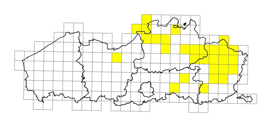 Voorkomen van wolf in Vlaanderen in het monitoringsjaar 2021-2022 volgens de Centraal-Europese monitoringsstandaard. Een hok wordt ingekleurd na drie C2-waarnemingen of één C1-waarneming. Voor de kaart van Vlaanderen gebruiken we UTM-hokken, voor de Europese rapportage gebruiken we een EU-grid.