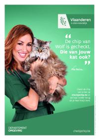 Check je chip. Natalia en kat - Affiche. De chip van Wolf is gecheckt. Die van jouw kat ook?