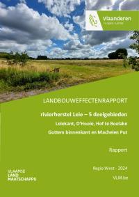 Het Landbouweffectenrapport onderzoekt de impact van het rivierherstelproject Leie op landbouw in de deelgebieden Leiekant, D’Hooie, Hof te Boelake, Gottem binnenkant en Machelen Put. Het rapport beschrijft de effecten van de inrichting van watergebonden natuur op landbouwbedrijven, percelen en sector. De studie brengt de gevolgen in kaart voor inkomens, bedrijfsvoering, werkgelegenheid en grondgebruik, en onderscheidt vijf categorieën van impact (van minimaal tot groot effect).